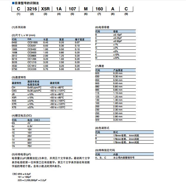 貼片電容的命名通常由幾個(gè)部分組成,包括廠商標(biāo)識(shí)、系列號(hào)、尺寸代碼、容量值、容量單位、電壓值、誤差等級(jí)以及其他特性標(biāo)識(shí)。這些部分通過(guò)特定的字母、數(shù)字或符號(hào)組合來(lái)表示。